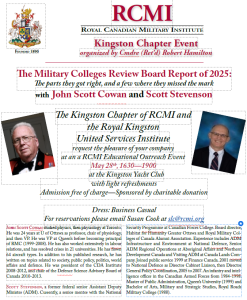 RKUSI will partner with RCMI Kingston and host a panel discussion from 1630 to 1900 hours at the Royal Kingston Yacht Club. Scott Stevenson, Chair of Advocacy and Promotion for the RMC Alumni Association and the former RMC Principal, Dr. John Scott Cowan will discuss the recent Canadian Military Colleges (CMC) Review Board report. Details as follows: